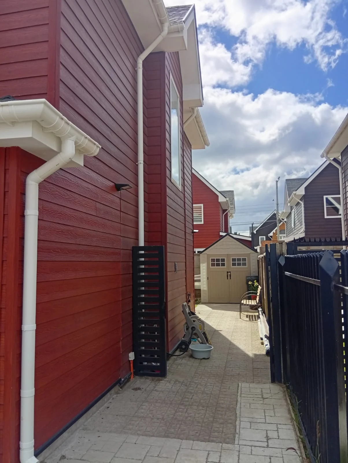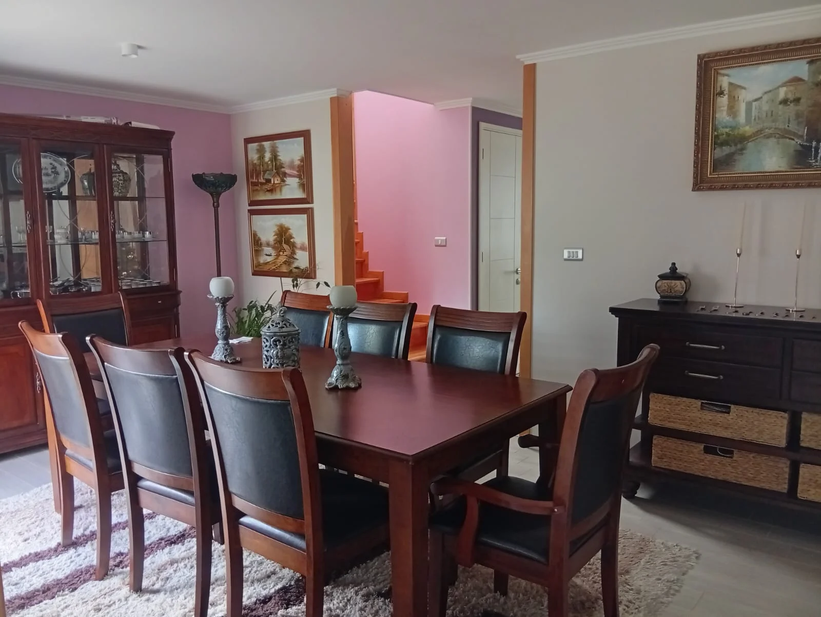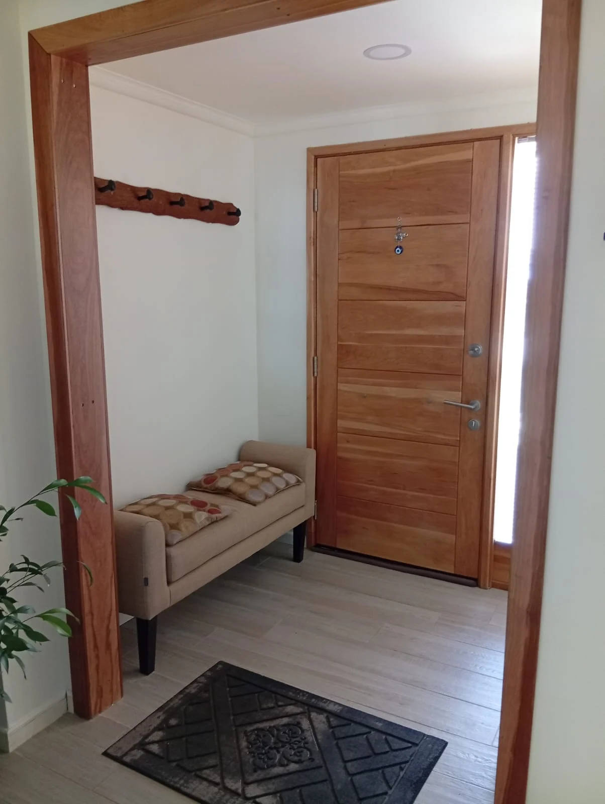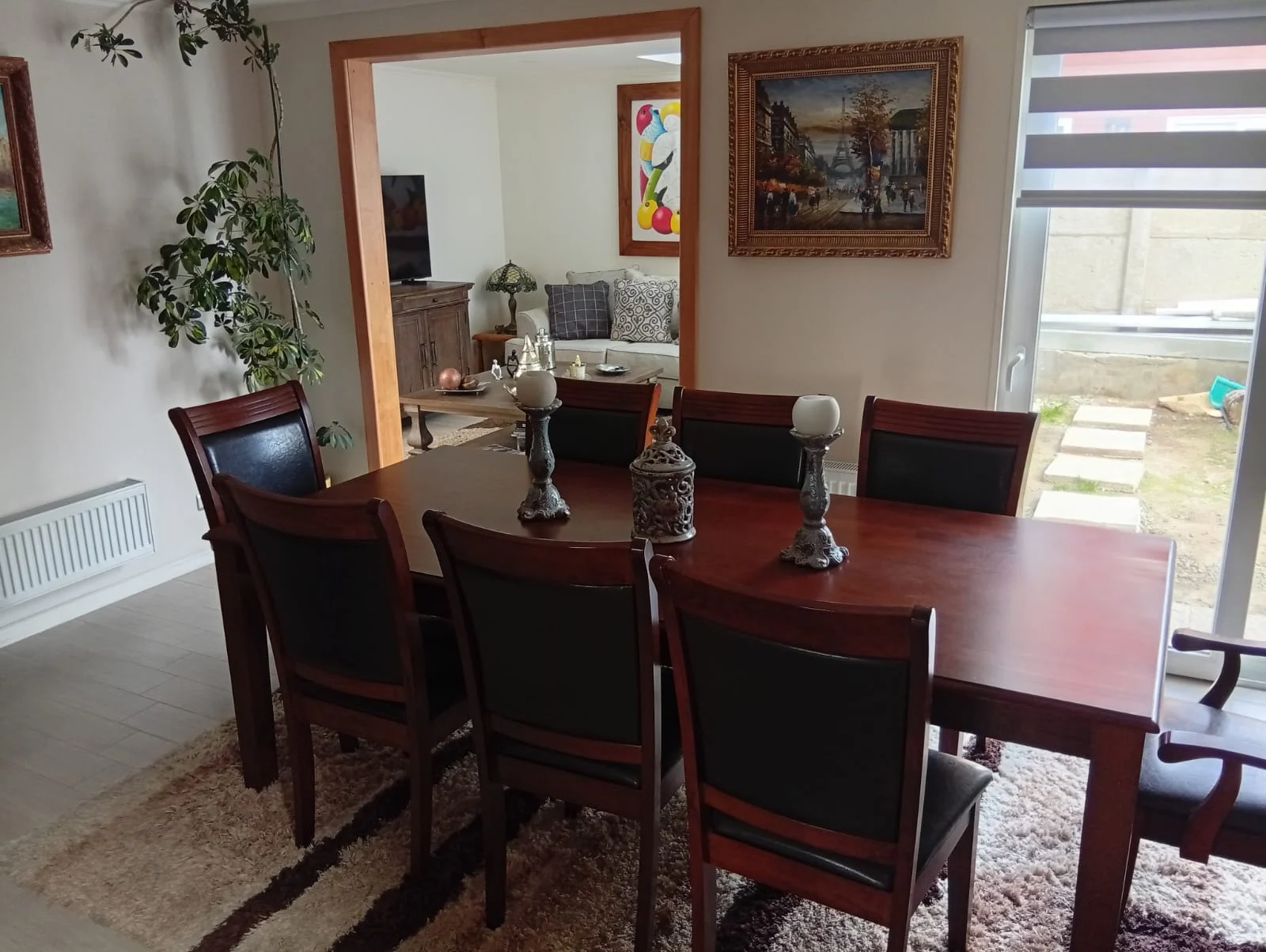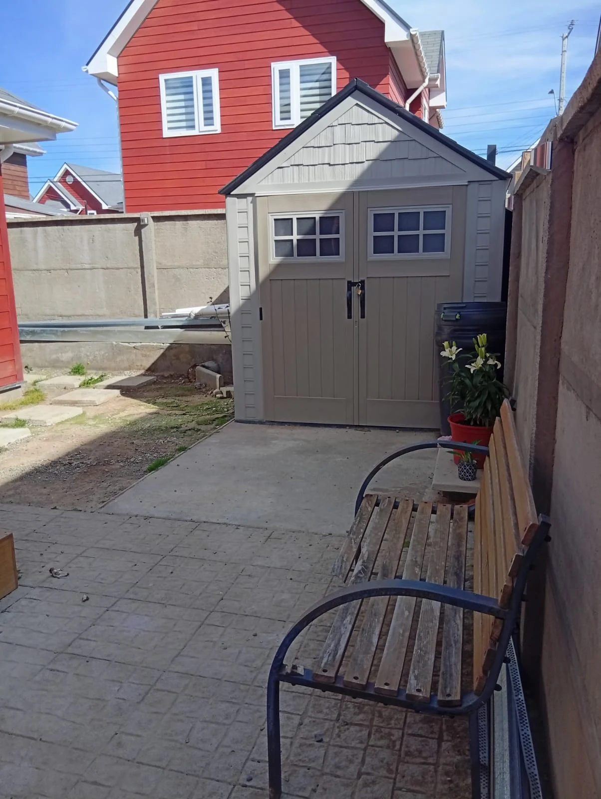 Entrada con pavimento estampado, reja, portón automático, citófono, calefacción por losa radiante y radiadores, cortinas roller